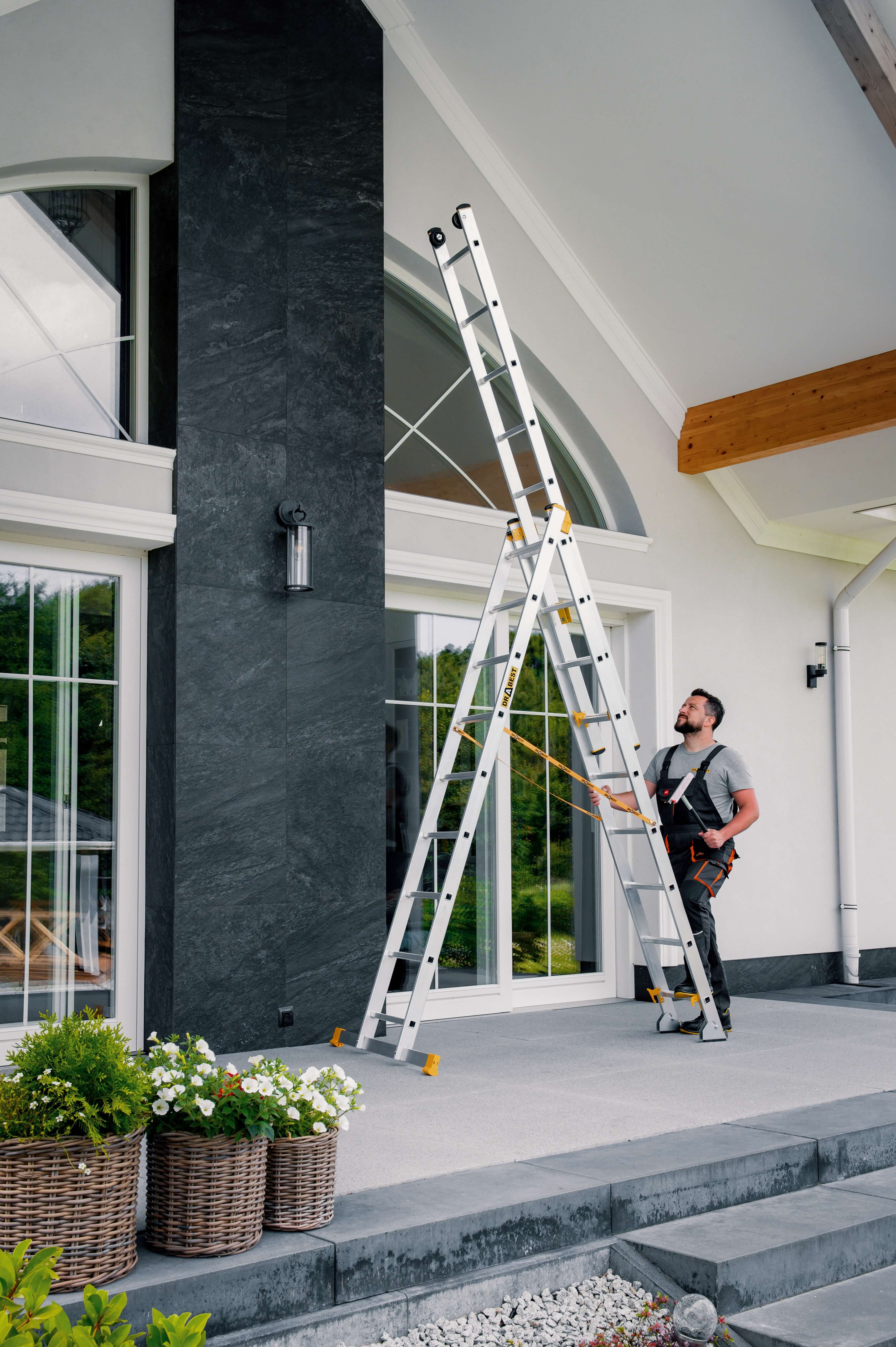 • trzy-elementowa konstrukcja drabiny pozwala na elastyczne dostosowanie jej do różnych zadań. Możliwość korzystania z jednego elementu drabiny sprawia, że można ją używać w formie przystawnej, zapewniając równocześnie pełne bezpieczeństwo;