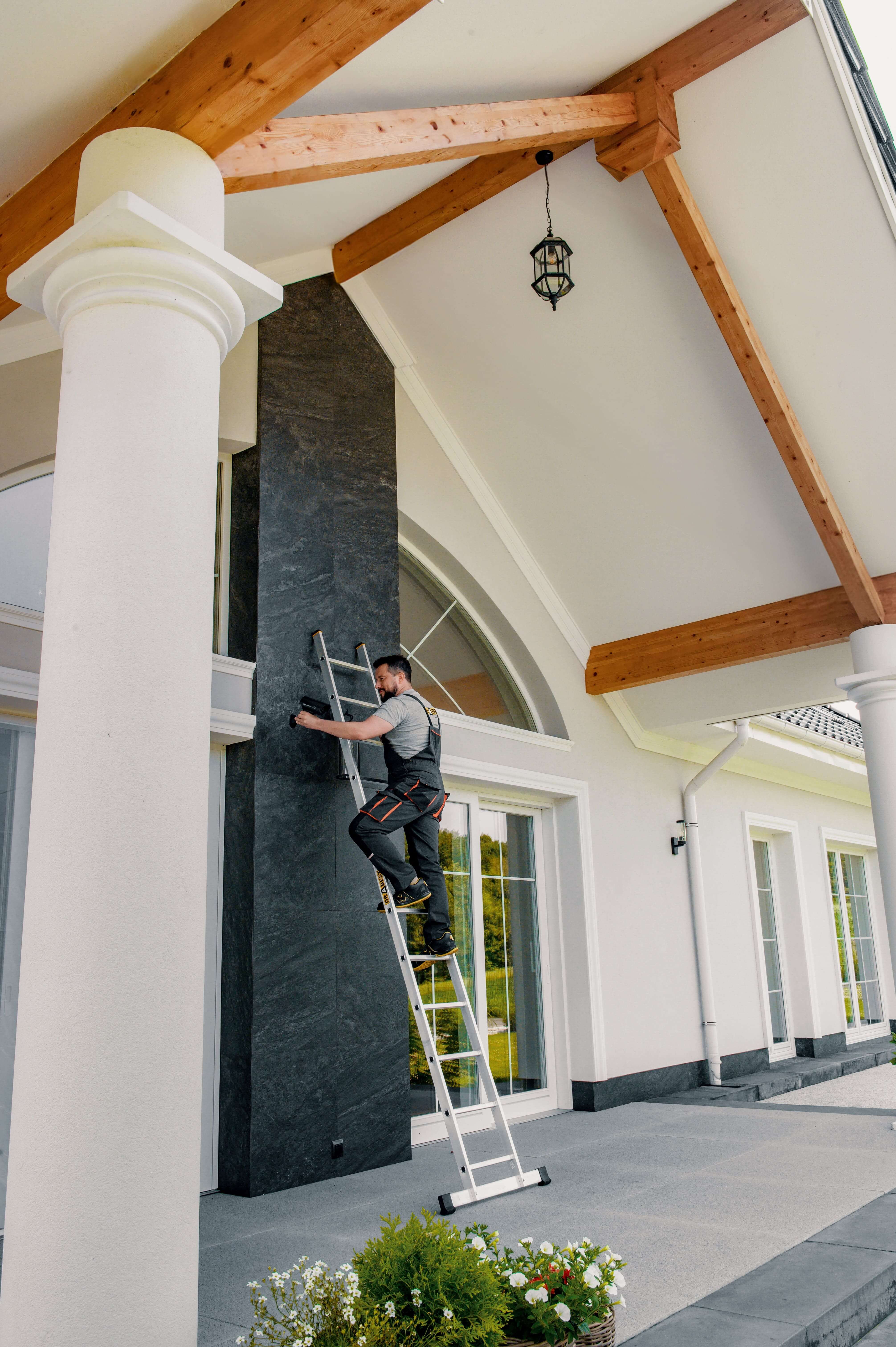Profesjonalna aluminiowa drabina przystawna, z której korzysta tysiące specjalistów branży technicznej, zajmujących się serwisem urządzeń, remontami czy wykończeniem wnętrz. Parametry drabiny dobrane są tak, by sprawdzić się w pracach na dużych wysokościach.