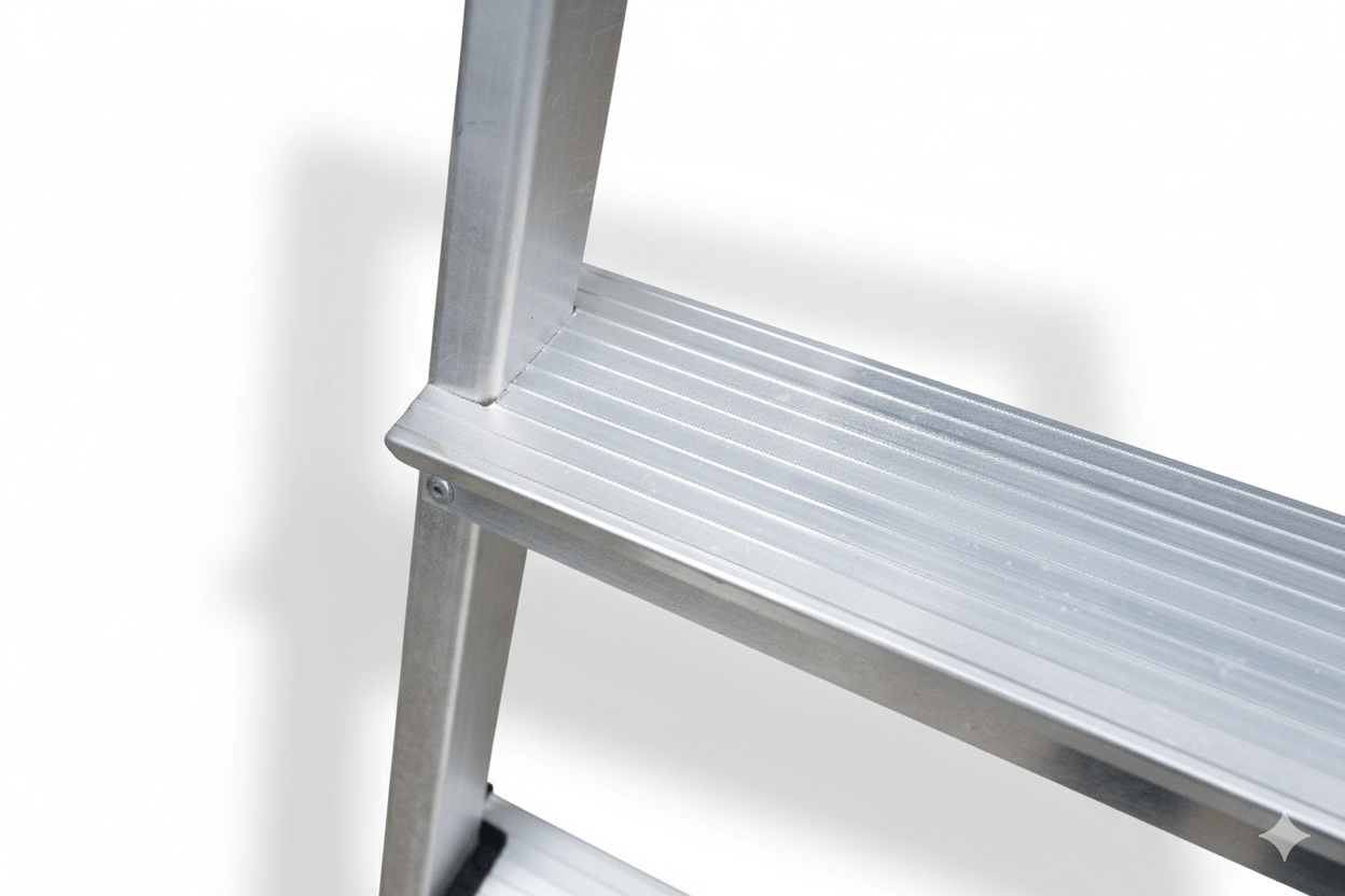 Każdy ze stopni drabiny został zaprojektowany z myślą o maksymalnym bezpieczeństwie użytkownika. Stopnie są szerokie, co zapewnia wygodną powierzchnię do stania, a antypoślizgowe nakładki dodatkowo zwiększają stabilność i minimalizują ryzyko poślizgnięcia się podczas pracy.