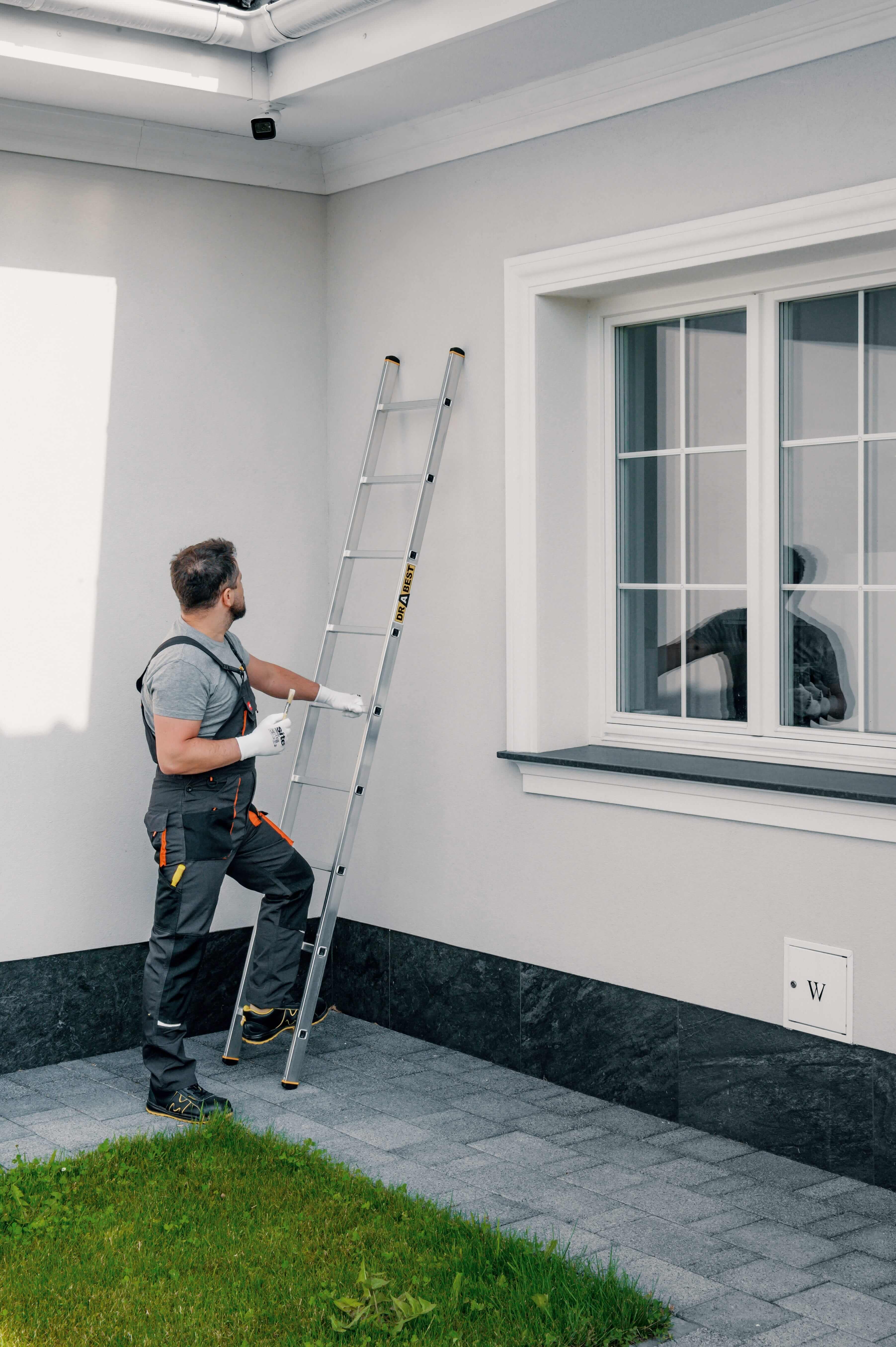 Profesjonalna aluminiowa drabina przystawna, z której korzysta tysiące specjalistów branży technicznej, zajmujących się serwisem urządzeń, remontami czy wykończeniem wnętrz. Parametry drabiny dobrane są tak, by sprawdzić się w pracach na dużych wysokościach.
