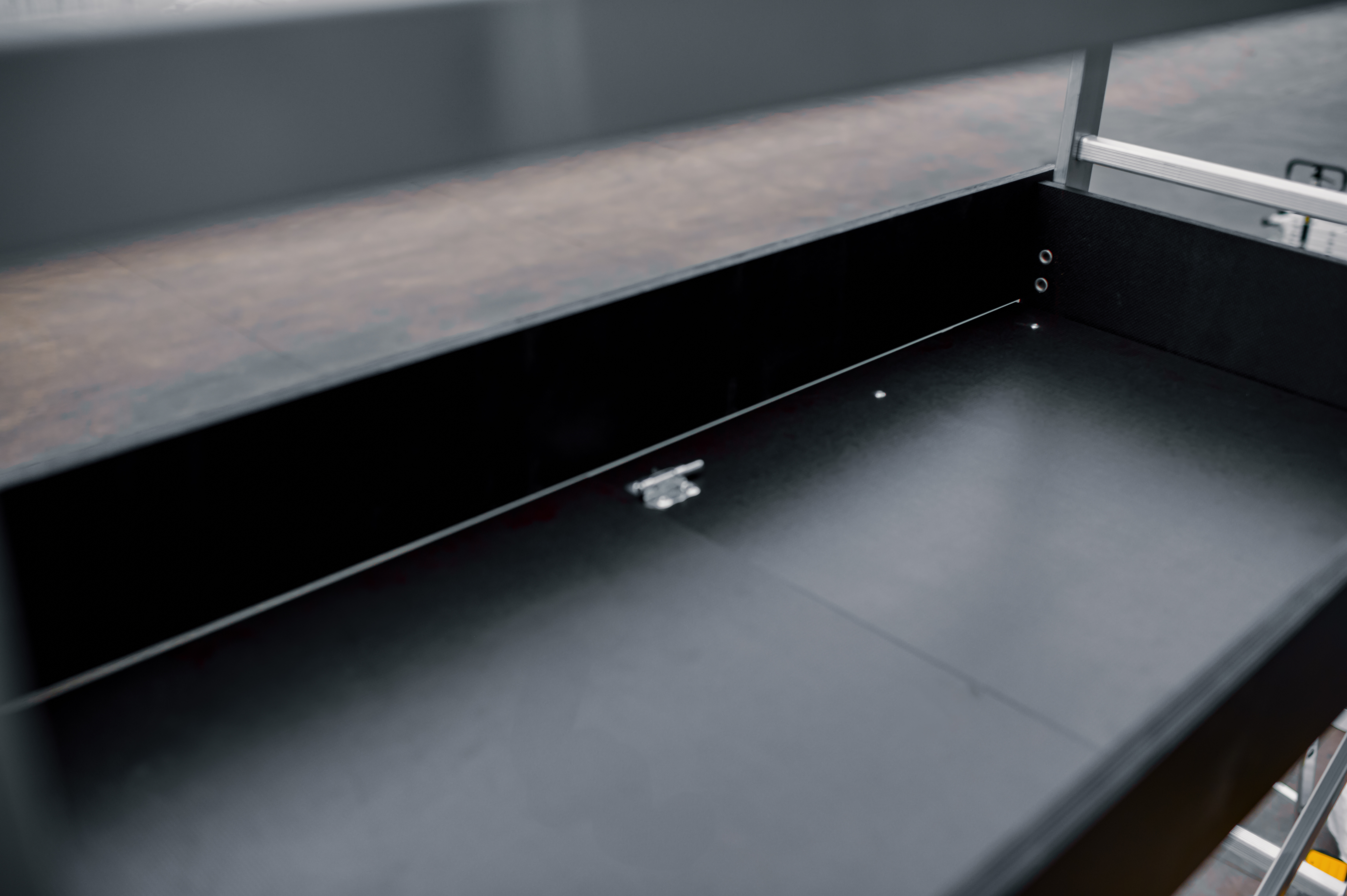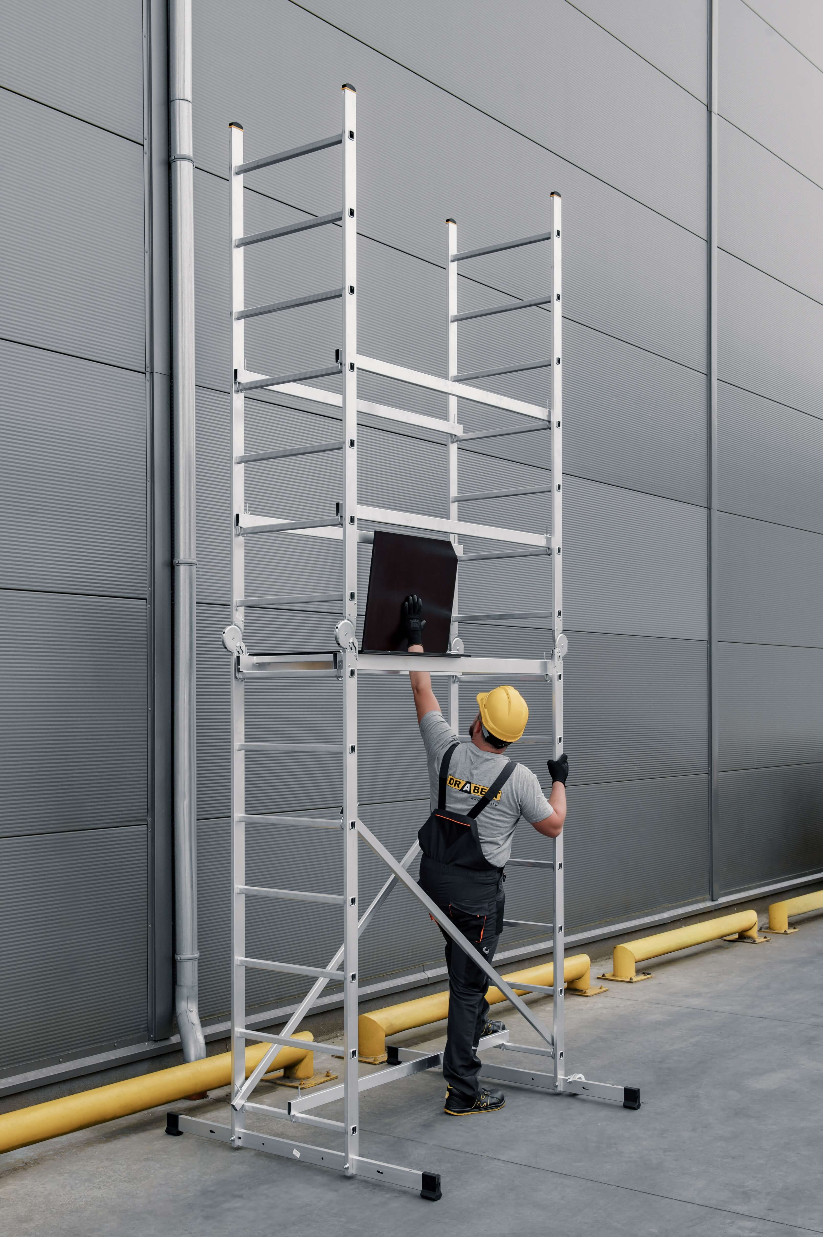 Podest o wymiarach 1,34 x 0,60 m zapewnia dużą przestrzeń roboczą, umożliwiając swobodne ustawienie narzędzi oraz wygodne poruszanie się podczas pracy. Konstrukcja składa się z dwóch części, z których jedna jest uchylna, co pozwala na łatwe wejście i zejście z rusztowania, a także ułatwia jego szybki montaż i demontaż.