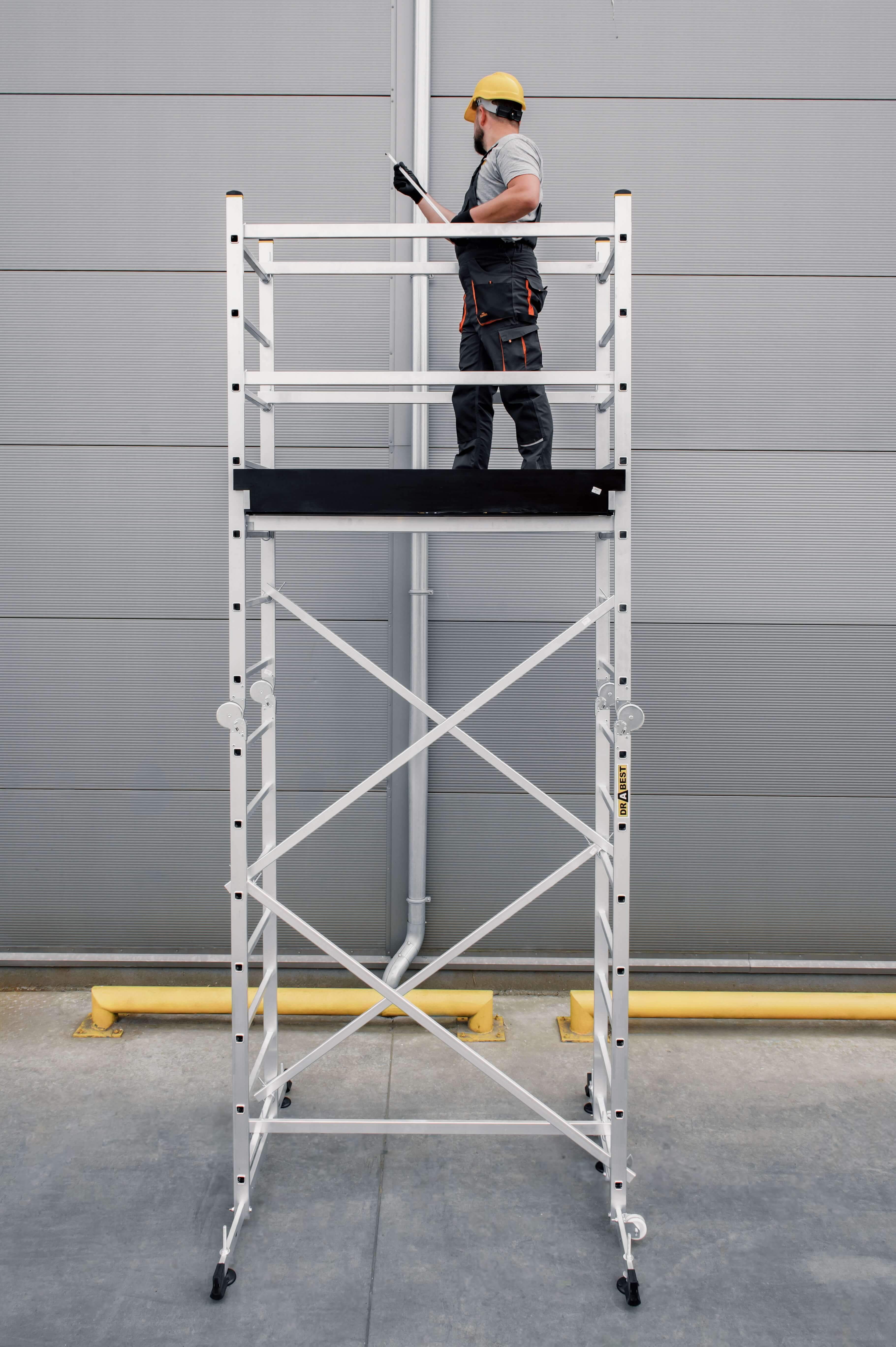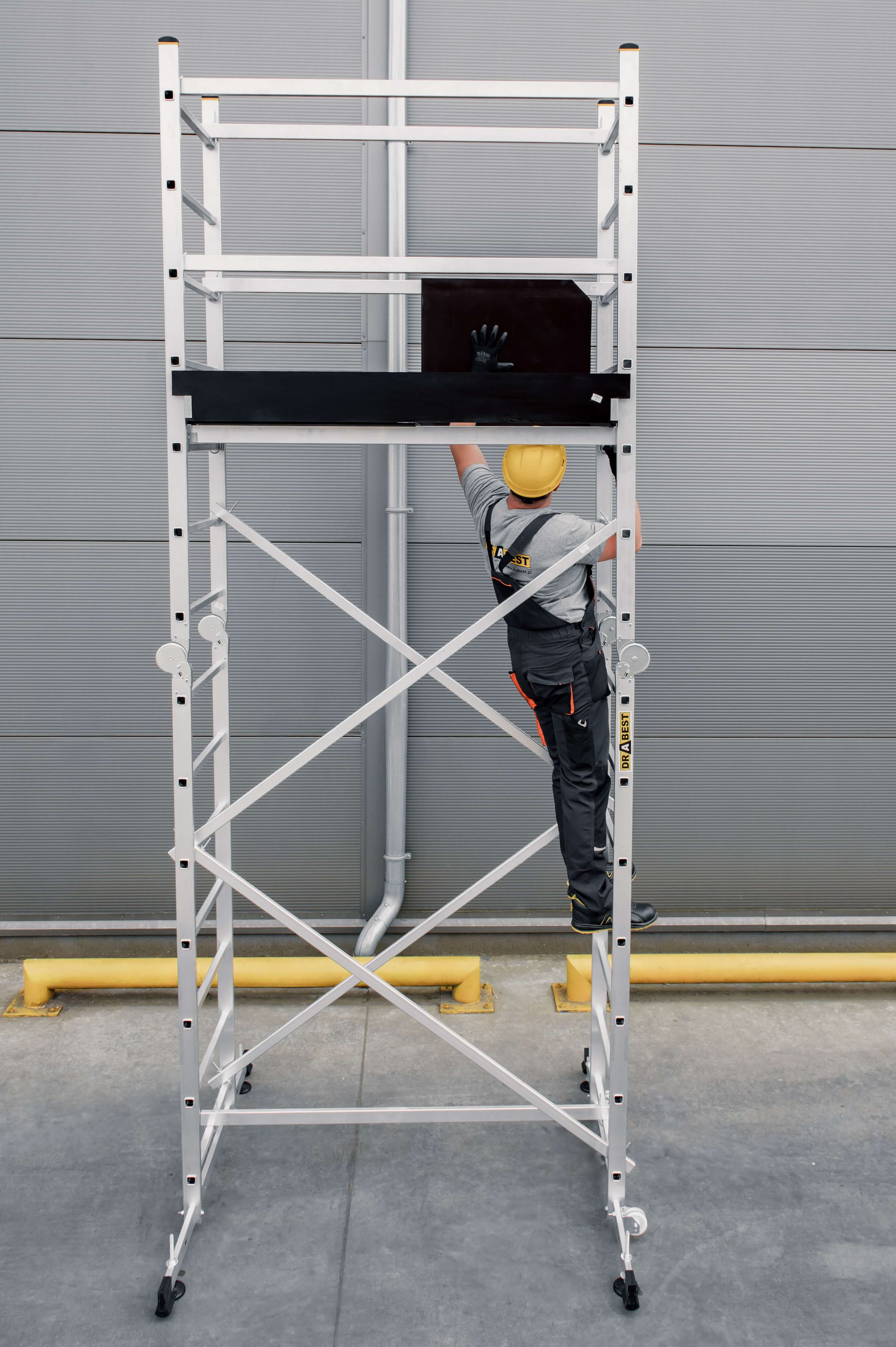 Rusztowania jezdne drabinowe HECTOR to konstrukcja zdecydowanie wielozadaniowa. Oprócz roli rusztowania, jej elementy możemy stosować również jako drabina wolnostojąca, drabina przystawna oraz podesty roboczy. Dzięki zamontowanym kółkom z tworzywa sztucznego bezproblemowo przytransportujesz rusztowanie w dowolne miejsce. Kompaktowe rozmiary po złożeniu również są jego atutem przy przenoszeniu i przechowywaniu. Sprawne rozkładanie i składanie, dzięki funkcjonalnym przegubom. Stabilizator rusztowania Hector jest ruchomy, przez co możesz ustawić dowolną odległość rusztowania od ściany, tak by zapewnić sobie komfort podczas wykonywanej pracy. Konstrukcja rusztowania oraz wszystkich jego konfiguracji drabin, posiada pełną zgodność z europejską normą bezpieczeństwa i wytrzymałości EN 131.